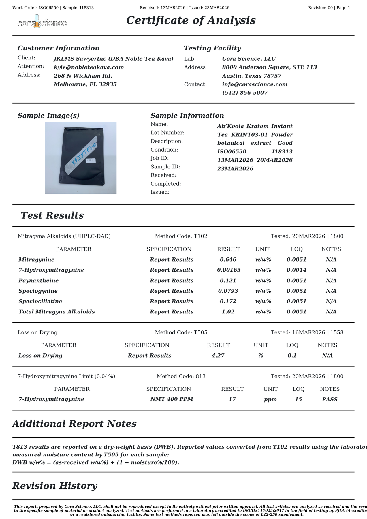 Updated from your latest Ah'Koola Kratom Instant Tea COA. Total Mitragyna alkaloids tested at 1.02% w/w, with 7-hydroxymitragynine testing at 0.00165% w/w and 17 ppm on the dry-weight limit panel, which passed the 400 ppm maximum.